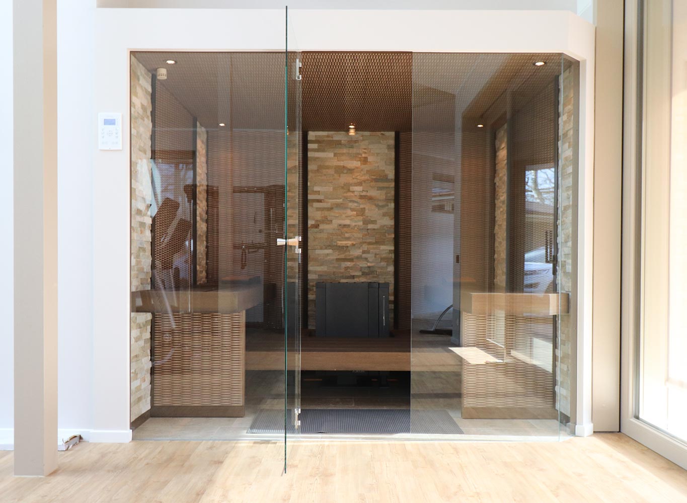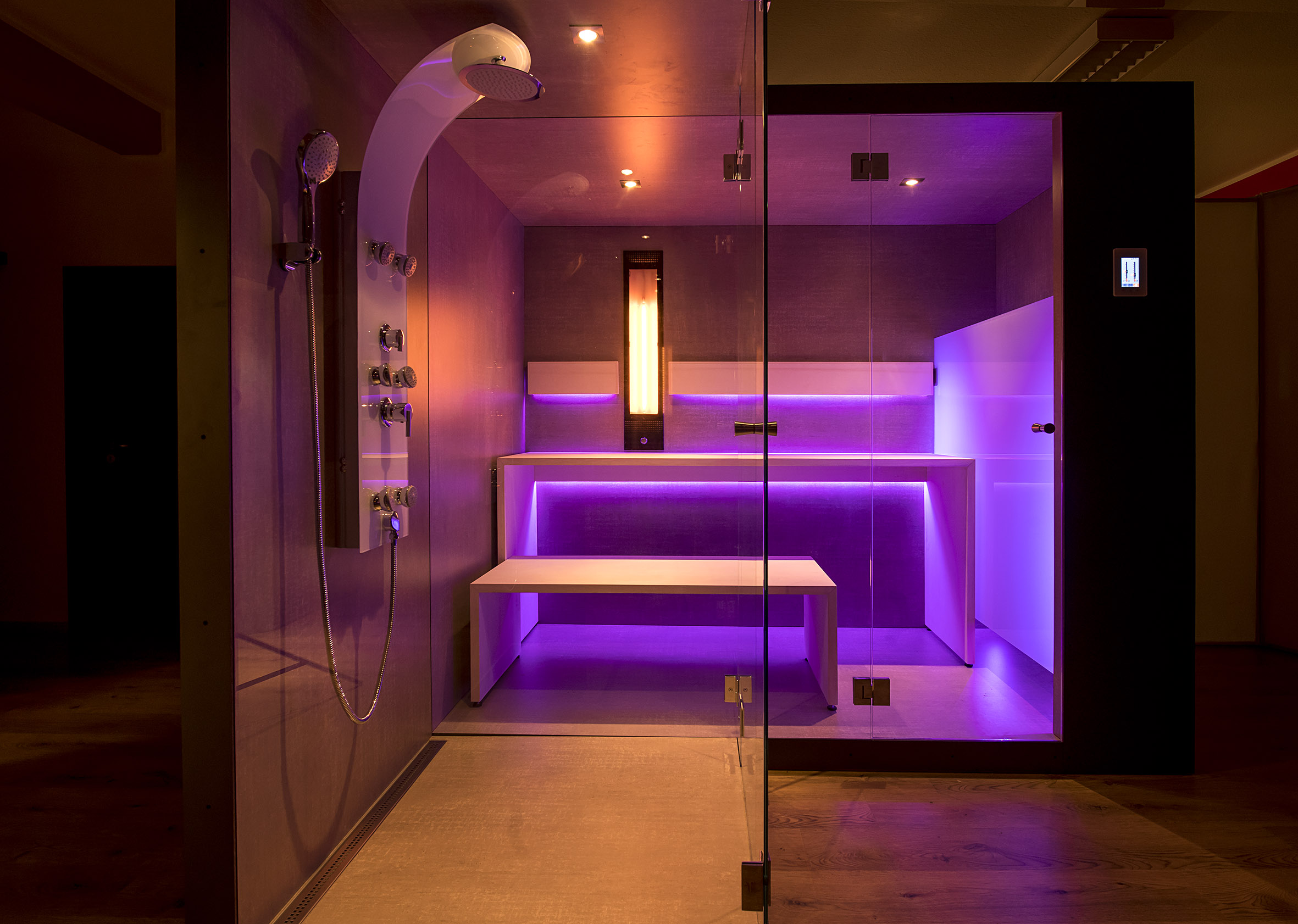 Im Bereich der Designsaunen des Cube P wird zudem afrikanisches Ayous sowie Espe als massive Wandbeplankung verwendet. Im Cube L verwenden wir spezielle, für den Saunabau hergestellte Edel-Echtholzfurniere verschiedenster Holzsorten. Da sie geruchsneutral sind, eignen sie sich bestens für edle Saunen und Infrarotkabinen. Bei der Inneneinrichtung kommt das splitterfreie Ayous-Holz ebenso zum Einsatz wie Espe. Diese Hölzer nehmen nur wenig Wärme auf und sind daher besonders gut für diesen Zweck geeignet.